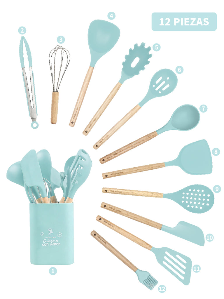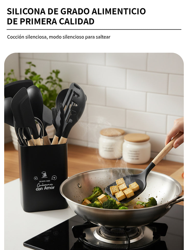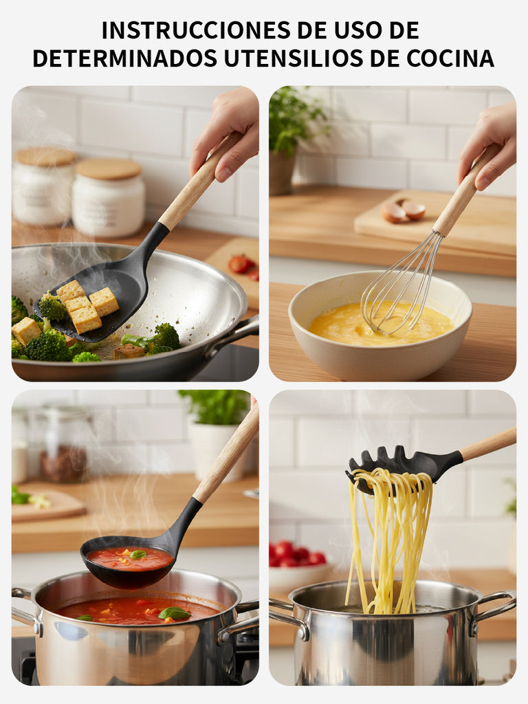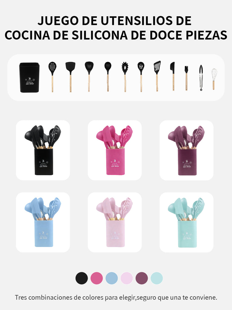 Set completo de utensilios de cocina de silicona (12 piezas) con mangos de madera y soporte/recipiente para mantener todo ordenado. Incluye espátulas, cucharones, cuchara ranurada, servidor de pasta, pinzas y batidor para cubrir todas las tareas diarias. Suaves con sartenes antiadherentes, fáciles de limpiar, con orificio para colgar y disponibles en varios colores.