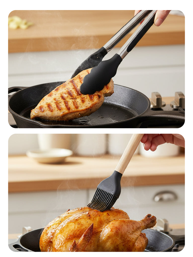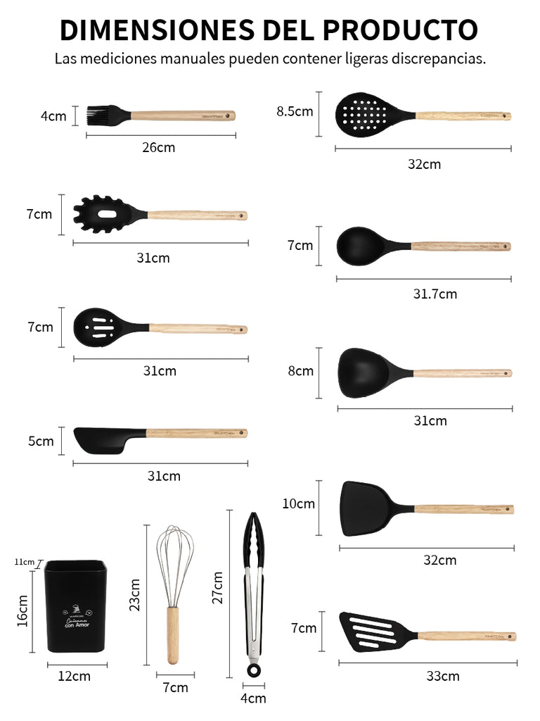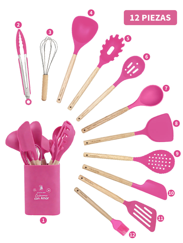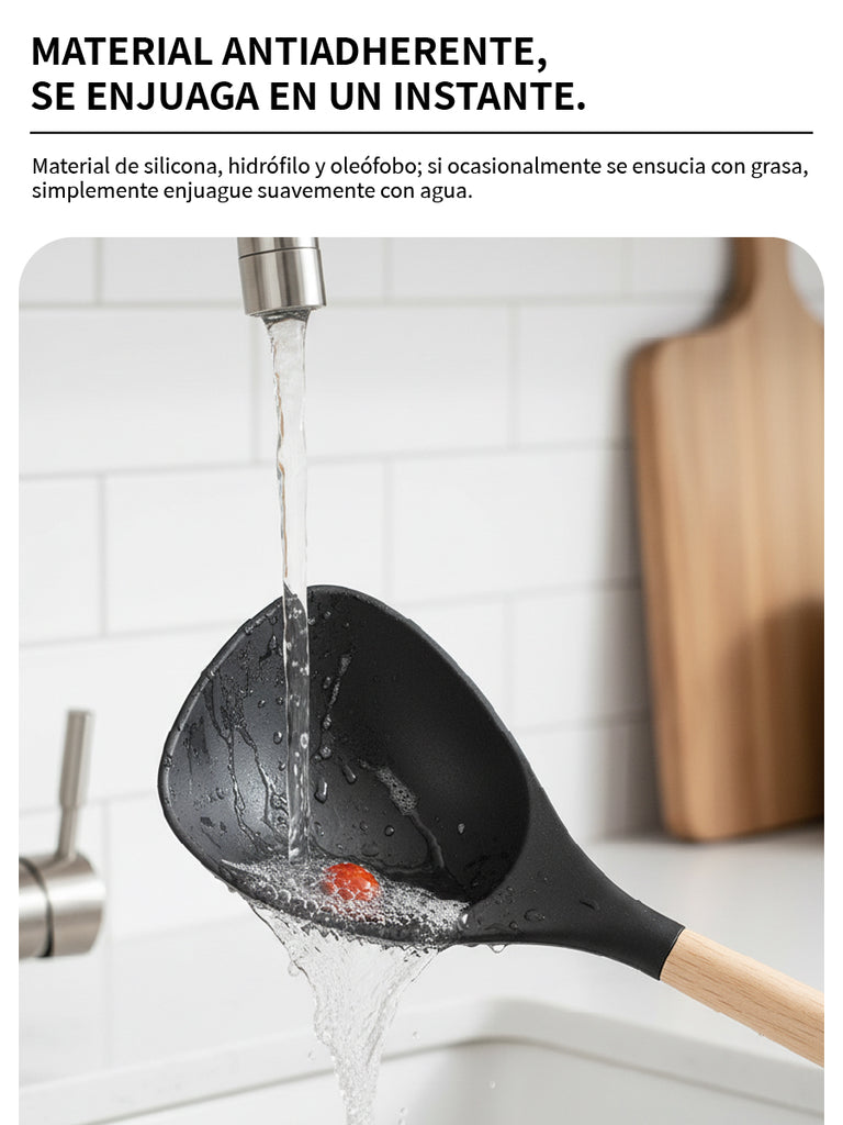 Set completo de utensilios de cocina de silicona (12 piezas) con mangos de madera y soporte/recipiente para mantener todo ordenado. Incluye espátulas, cucharones, cuchara ranurada, servidor de pasta, pinzas y batidor para cubrir todas las tareas diarias. Suaves con sartenes antiadherentes, fáciles de limpiar, con orificio para colgar y disponibles en varios colores.